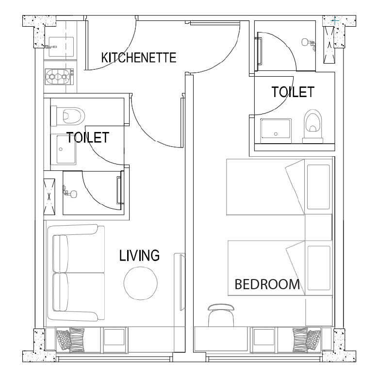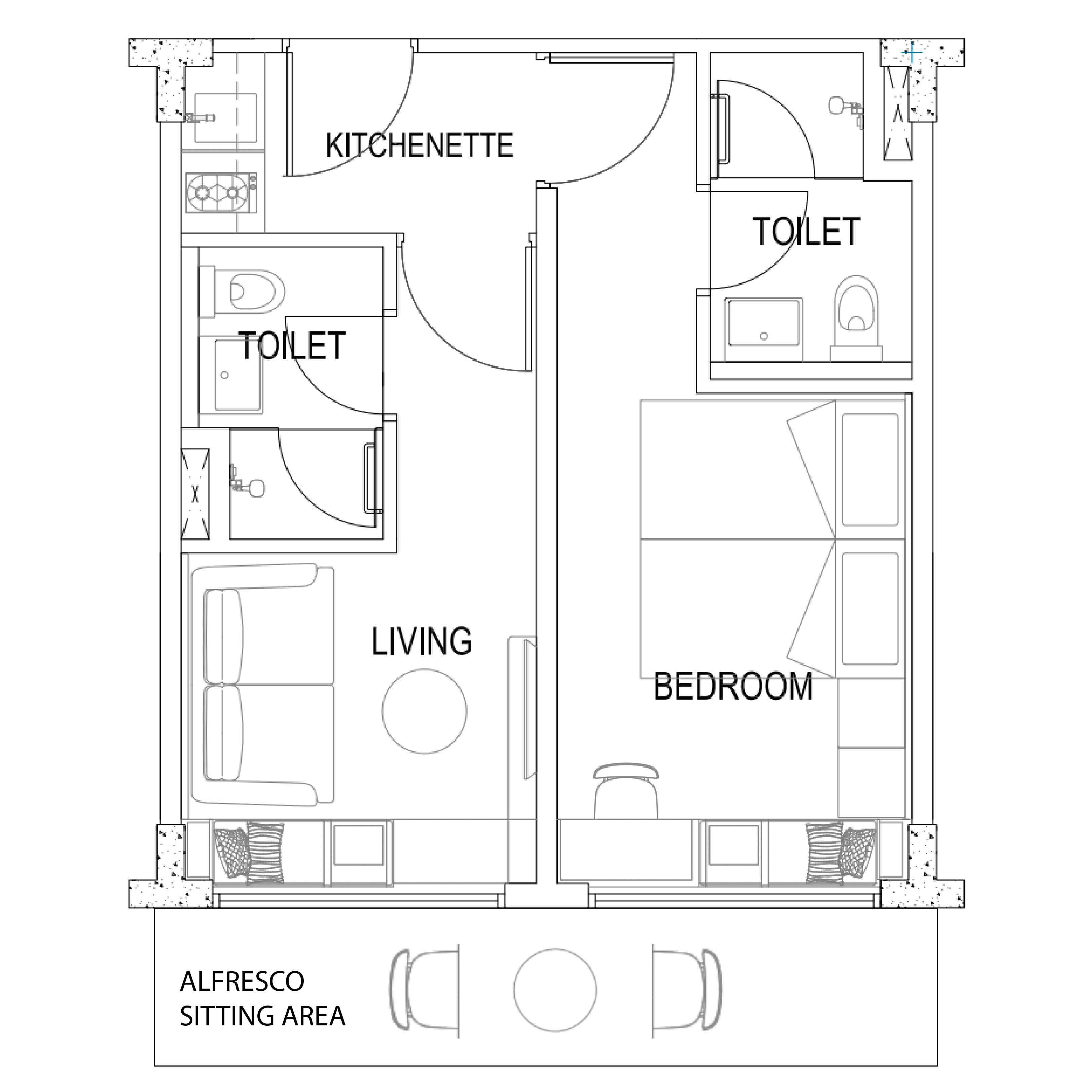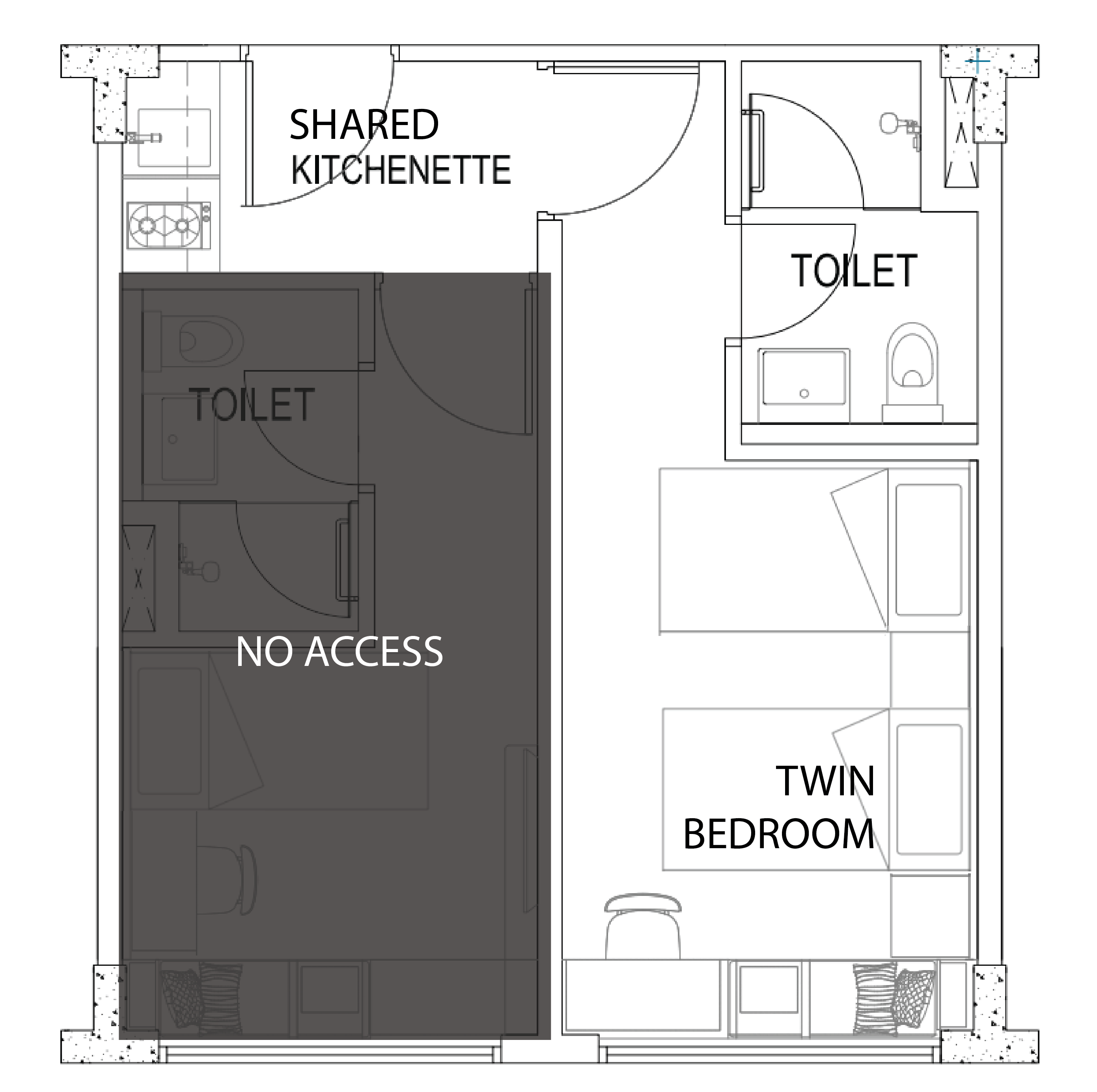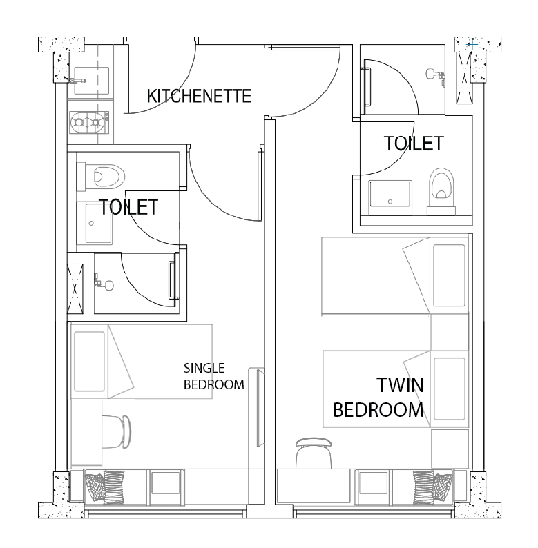The larger room comes with 2 Single Beds, while the smaller room is furnished with a Single Bed. Each room has its own workstation and ensuite bathrooms. Perfect for those who want a private kitchenette. Do note that there is no Living Room included.
